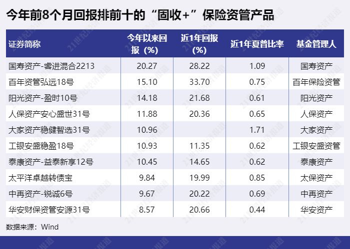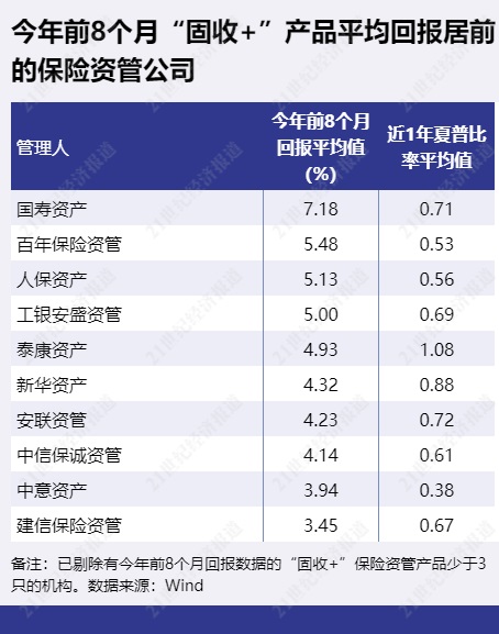 而“固收+”产品前8个月平均回报排名靠后的保险资管公司有民生通惠、合众资产等。