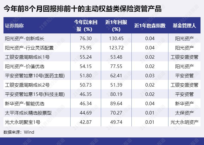主动权益类保险资管产品中,以“阳光资产-创新成长”8月净值增长势头最猛,8月净值涨幅达33.61%,前8月回报因此高达76.3%,毫无悬念成为前8月回报最高的主动权益类保险资管产品。阳光资产另一只产品“阳光资产-行业灵活配置”8月净值涨幅也高达31.93%,前8个月回报紧随其后排第二。两只产品前8个月回报超过75%。