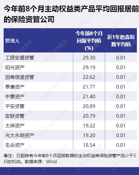 保险资管公司主动权益类产品表现更出色,有7家公司今年前8个月主动权益类产品平均回报超过20%,排前三的分别是工银安盛资管、阳光资产、招商信诺资管。相比上月,部分公司排名发生变动,比如中意资产排名上升五位,生命资产排名下滑六位。
